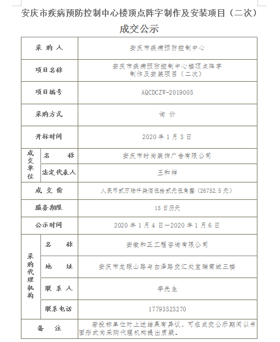 安慶市疾控中心樓頂點(diǎn)陣字制作及安裝項(xiàng)目二次成交公示