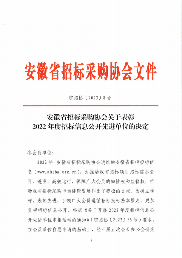 熱烈祝賀安徽和正工程咨詢有限公司---榮獲2022年度招標信息公開先進單位